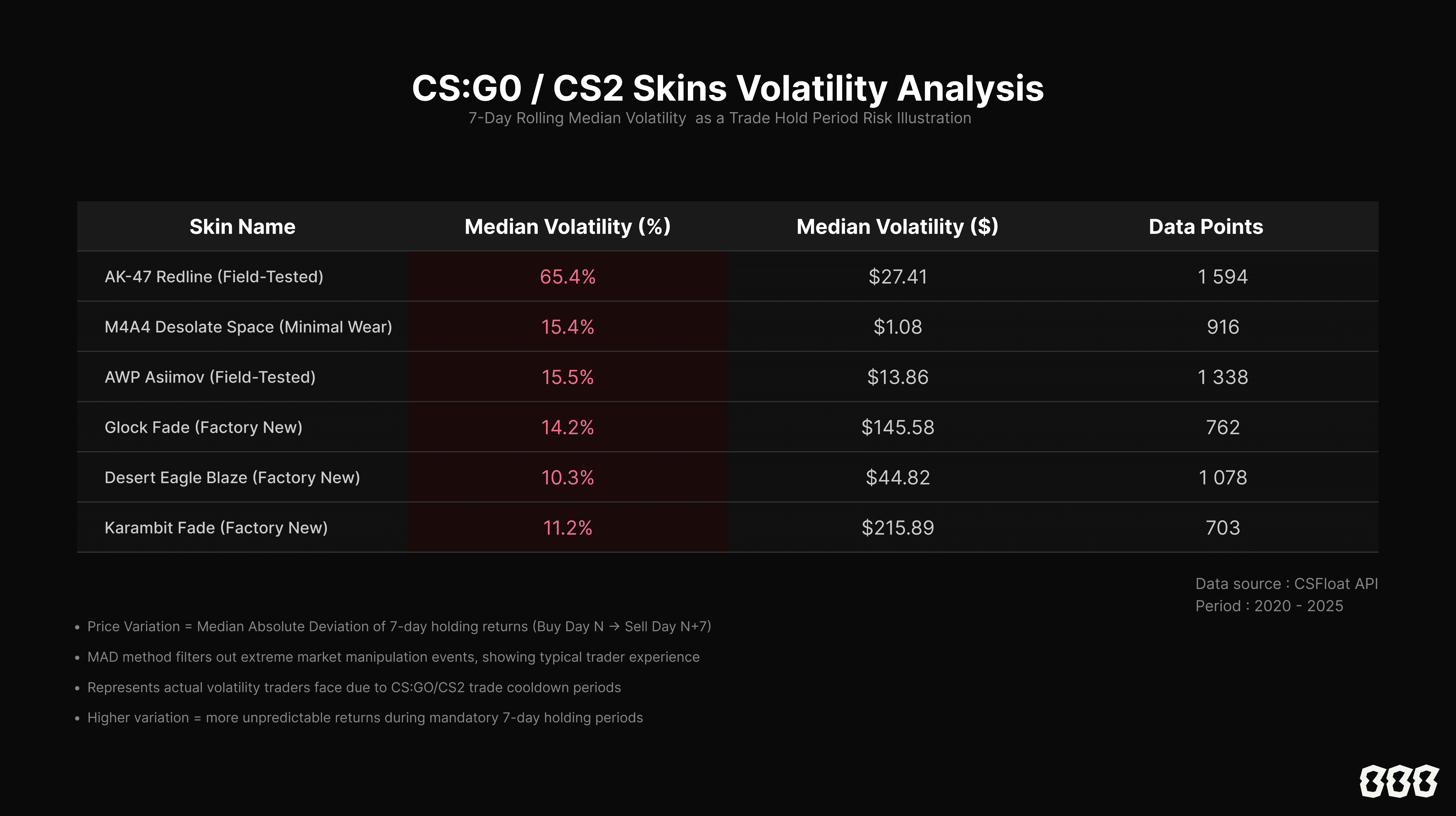 Coming back on the 7 day cooldown, it poses a real risk for traders. We computed the 7-Day median Volatility with price data from CSFloat for some of the most traded skins and the data speaks for itself. All the skins studied experience a median volatility above 10% with the most liquid (AK-47 Redline Field-Tested) reaching 65.4%. This annualizes to 469% for the AK and 108% for skins with a median volatility of 15%. For reference, current 7-day annualized volatility sits at 37.8% for Bitcoin and 78.6% for Ethereum.